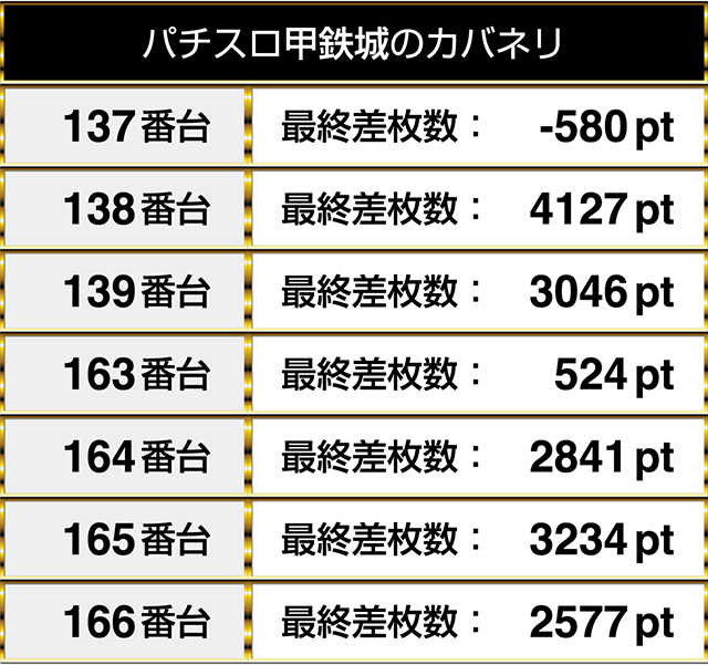 『パチスロ甲鉄城のカバネリ』の163番台から166番台までが並んでプラスとなり、3台が2000ptオーバー!!