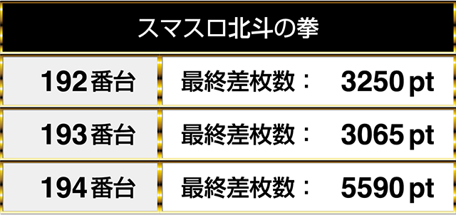 『スマスロ北斗の拳』は3台が並んで3000ptを上回り、1台は5590ptでこの日を終えた。