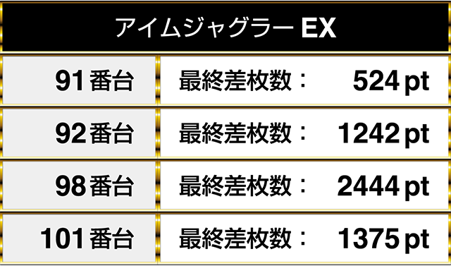 『アイムジャグラーEX』にもプラスptとなる台が複数あり、98番台は2444pt!