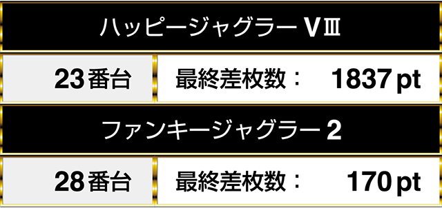 プラスptを記録する台は、『ハッピージャグラーVⅢ』と『ファンキージャグラー2』にもあった。