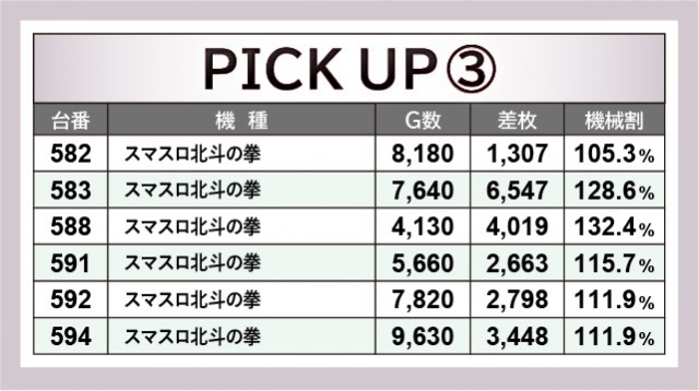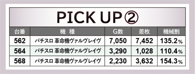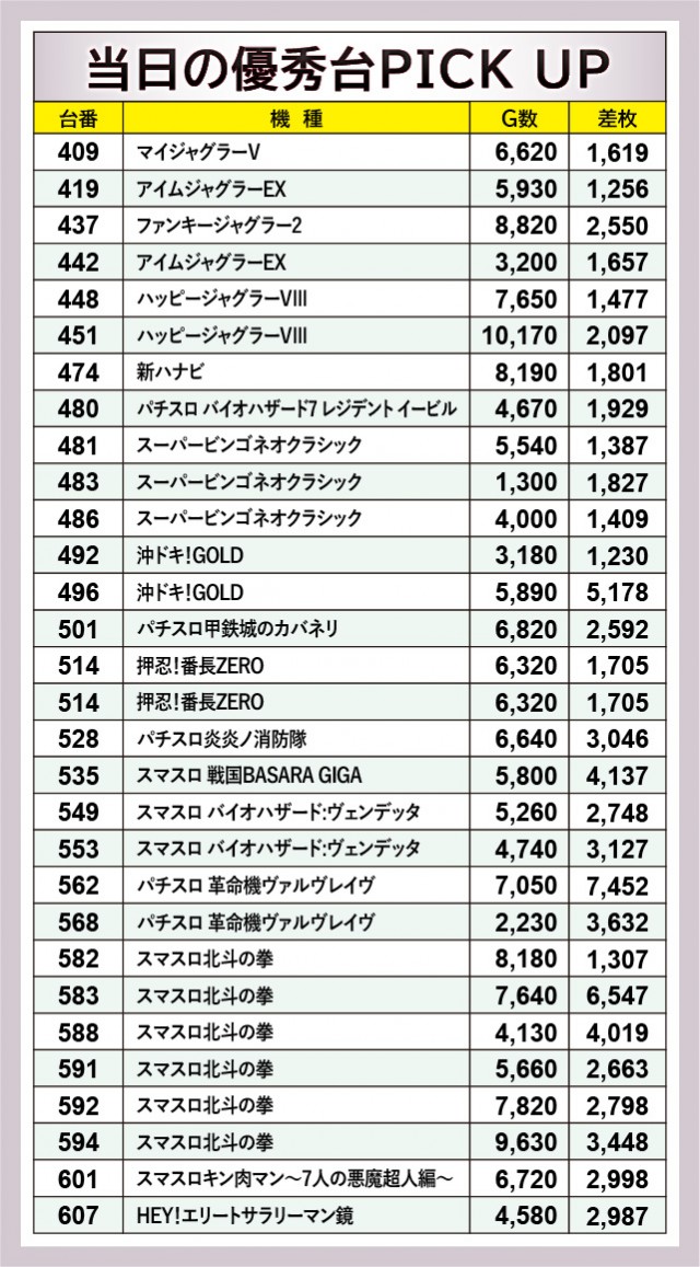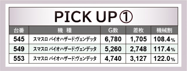 『パチスロ 革命機ヴァルヴレイヴ』562番台+7,452枚や『スマスロ北斗の拳』583番台+6,547枚など、両機種から凄まじい熱気が放たれていたのが前述した通りである。さらに後者は3~4千枚OVERも記録し、同機種が多くのファンから支持されている理由が窺えるばかりだ。また『スマスロ バイオハザード:ヴェンデッタ』553番台+3,127枚という数字も確認でき、やはりスマスロのポテンシャルの高さを実感せざるを得ない。
