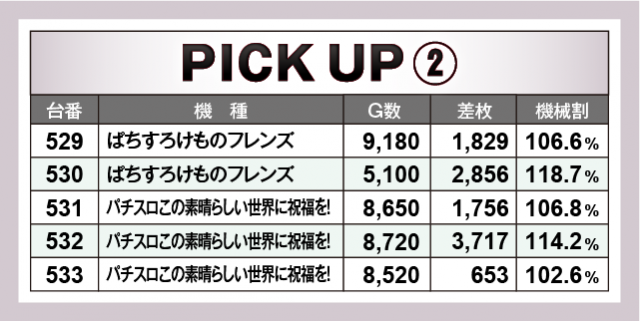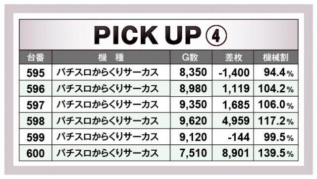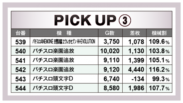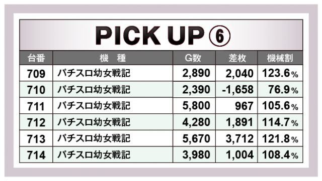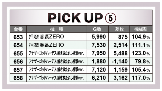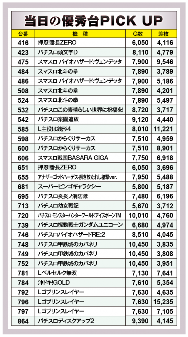 まずは優秀30台PICK UPをチェック。30台の全てが差枚数+3千枚以上を達成、+4千枚以上は23台、+5千枚オーバーは13台、+7千枚オーバーは6台とハイスコアを記録した。