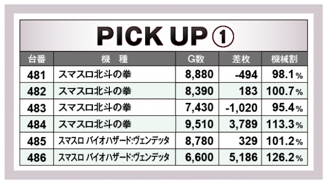 後述する横並び好況スポット以外では、585番台の『L主役は銭形4』で+11,221枚を獲得、ついで781番台の『Lベルセルク無双』で+7,641枚、さらに606番台の『スマスロ戦国BASARA GIGA』で+6,918枚をマークし、スマスロマシンの活躍が光った。