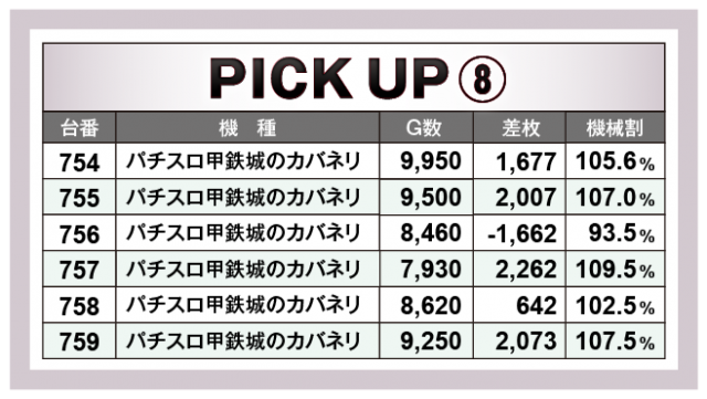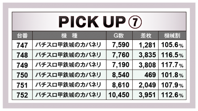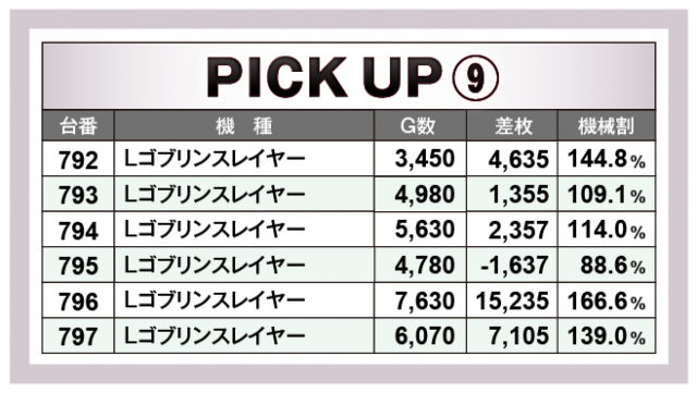 続いては9箇所計53台の横並び好況スポット。突出して目立っていたのが、この日のトップ差枚数を叩き出した「Lゴブリンスレイヤー」で、796番台の+15,235枚を筆頭に6台のトータル差枚数は+2万9千枚オーバーと大幅プラスを記録した。また、「パチスロ甲鉄城のカバネリ」では2箇所の並びで優秀台が発生。12台のトータル差枚数は+2万2千枚オーバーをマークした。