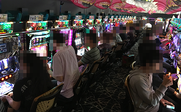 14時を過ぎた頃の20円パチスロでもっとも盛り上がっていたのは「バジリスク~甲賀忍法帖~絆」。多くのプレイヤーが機種の魅力を堪能しており、活気に満ちあふれるシマとなっていた。