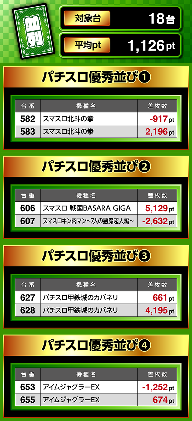 最新機種にも注目台が並び、606番台の「スマスロ 戦国BASARA GIGA」は5,100ptを上回った。