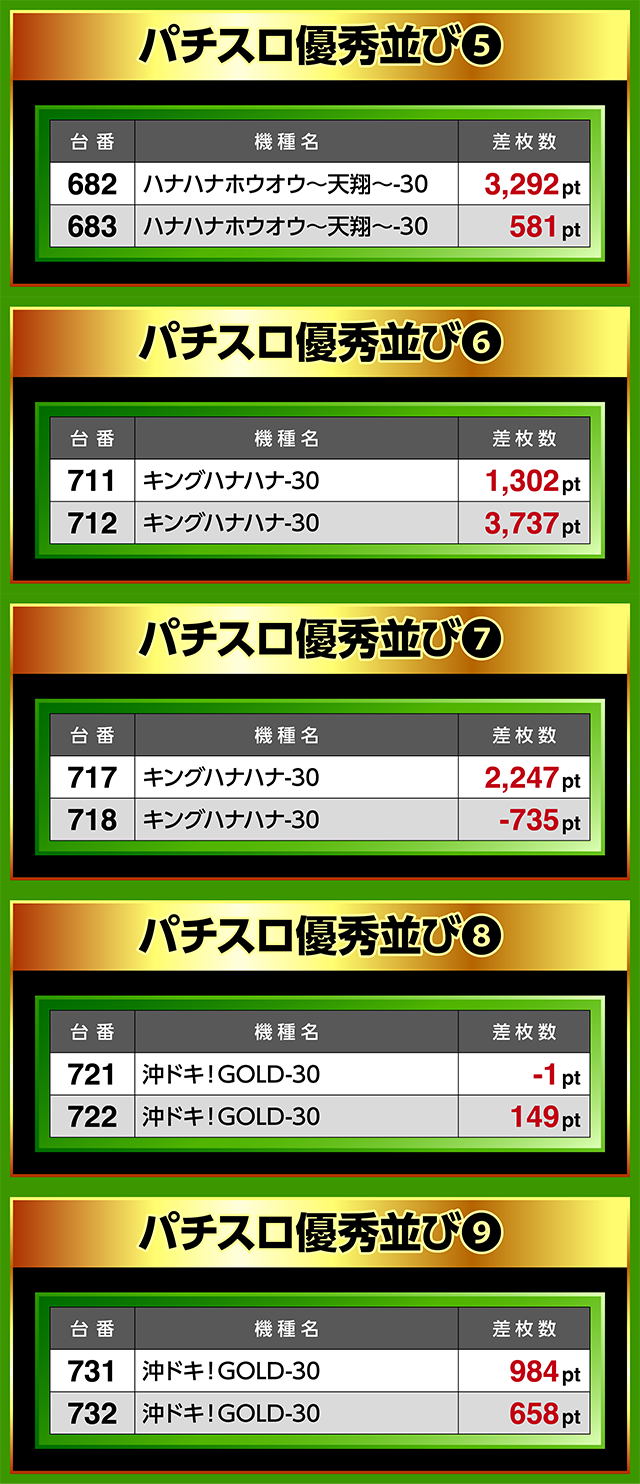 「ハナハナホウオウ~天翔~-30」では、682番台と683番台にプラスが続き、682番台は3,200ptを超えた。