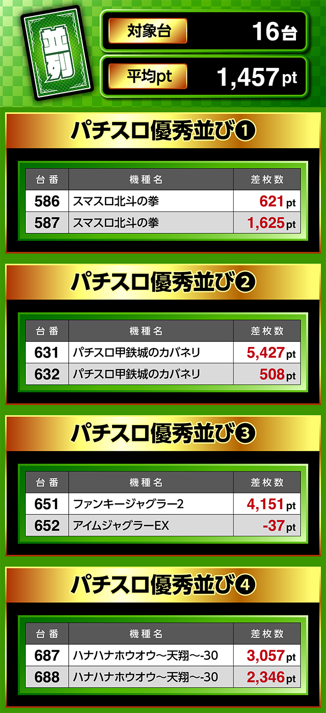 ジャグラーシリーズの並びでは、651番台の「ファンキージャグラー2」が4,151ptとなった。