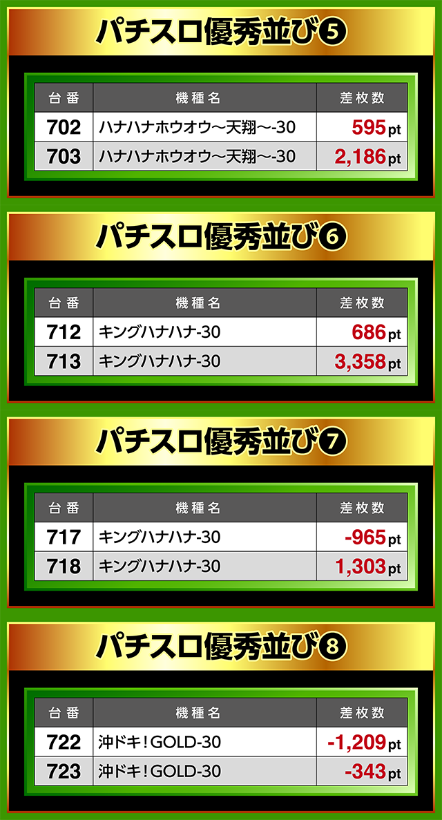 「ハナハナホウオウ~天翔~-30」の687番台と688番台が並んで2,300ptオーバー。