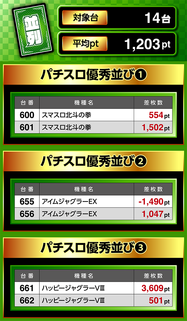 注目台が並ぶ場所はほかにもあり、601番台の「スマスロ北斗の拳」は1,502pt、の661番台の「ハッピージャグラーVⅢ」は3,600ptを上回った。