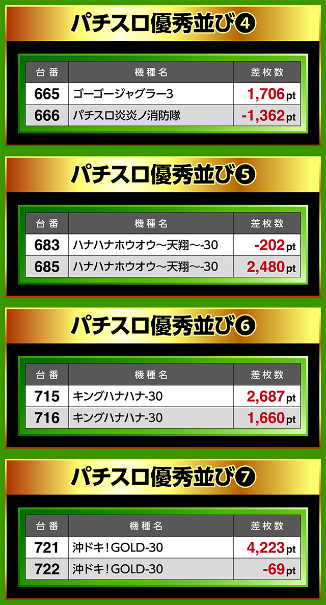 「沖ドキ!GOLD-30」の並びでは、721番台が4,200pt超。