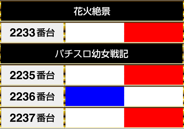 パチスロの状況をうかがうと、2233番台の『花火絶景』から2237番台の『パチスロ幼女戦記』までに笑顔が広がっていた。