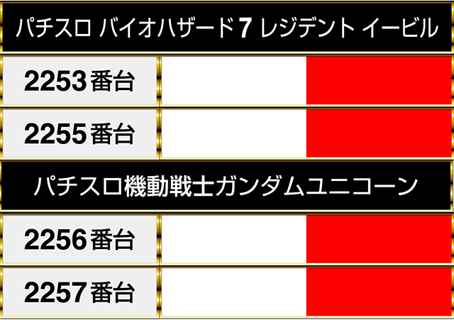 おなじシマにある『パチスロ頭文字D』や『パチスロ バイオハザード7 レジデント イービル』、『パチスロ機動戦士ガンダムユニコーン』にも活躍をするプレイヤーが並び、感じられるにぎわいは大きい。