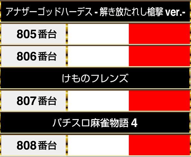 『アナザーゴッドハーデス-解き放たれし槍撃ver.-』の805番台から『パチスロ麻雀物語4』の808番台までにも笑顔が広がっていた。