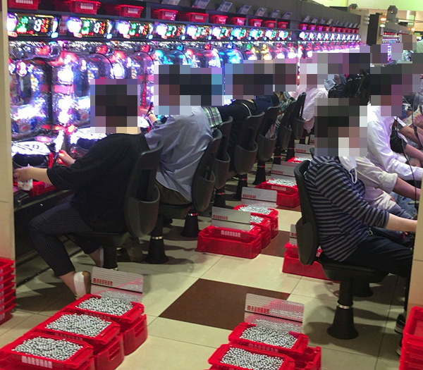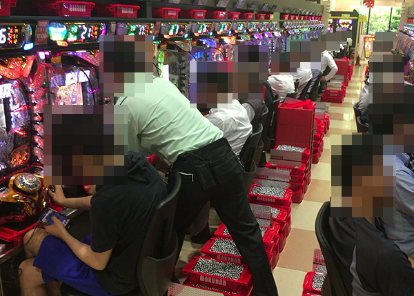 大勢の人でにぎわう1円パチンコにも、楽しげな様子で遊技をおこなうプレイヤーは多い。