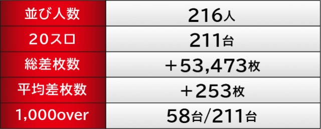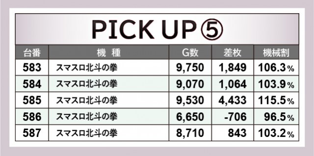 『スマスロ北斗の拳』はいずれも多くの回転数が消化された。585番台+4,433枚という数字は、何よりも同機種・同エリアが好調さを披露していたことが分かるはずだ。残念ながら全台プラス差枚とはならなかったが、粘り強く戦った形跡から鑑みるに、ファンは相当な手ごたえを感じていたに違いない。