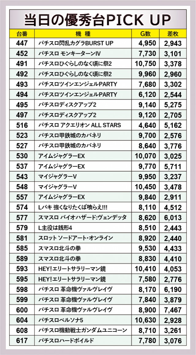 上表の優秀台をチェックすると、同店ではお馴染みとなった機種群が多く名を連ねている。懇切丁寧に扱われている『パチスロひぐらしのなく頃に祭2』を筆頭に、『ジャグラー』シリーズやスマスロ勢が目立っているが、『パチスロ閃乱カグラBURST UP』『スマスロ バイオハザード:ヴェンデッタ』ら単品機種の活躍も目に焼きつく。あらゆる機種にチャンスがあったことの証明で、同店らしい仕掛けが披露されたのではないだろうか。