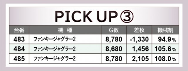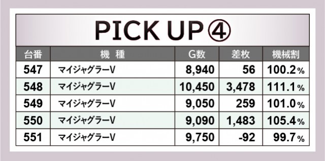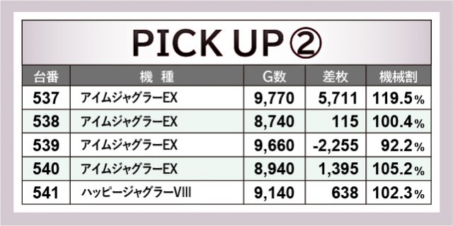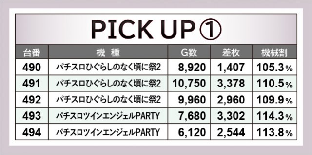 お馴染みの『パチスロひぐらしのなく頃に祭2』『パチスロツインエンジェルPARTY』は、回転数と差枚数が比例する展開を披露。その中で491番台+3,378枚や493番台+3,302枚といった記録が生まれ、しっかりと結果を残している点に好感を覚えるばかりだ。また『ジャグラー』シリーズも変わらぬ活躍ぶりを見せており、『アイムジャグラーEX』537番台+5,711枚や『マイジャグラーⅤ』548番台+3,478枚といった上々の結果には、多くのファンが安心感を覚えたことだろう。
