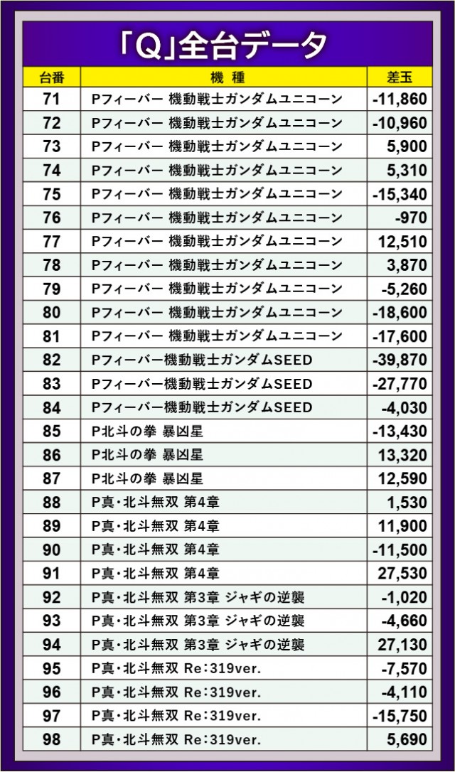 注目の新台『Pフィーバー機動戦士ガンダムSEED』は不調に見舞われたものの、『P真・北斗無双 第4章』『P真・北斗無双 第3章 ジャギの逆襲』が存在感を放っていた。91番台+27,530玉や94番台+27,130玉と大きな熱を放っており、人気シリーズであるが所以をしっかりと見せつけてくれた結果となっている。