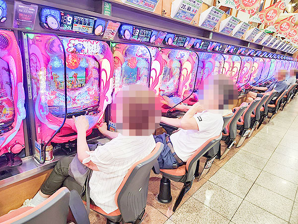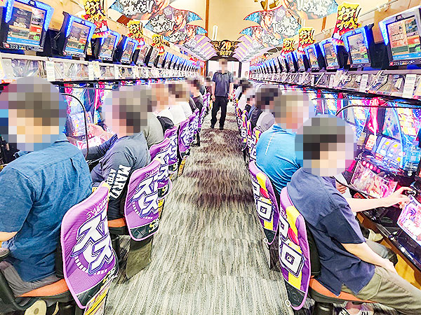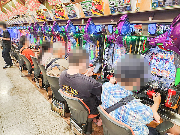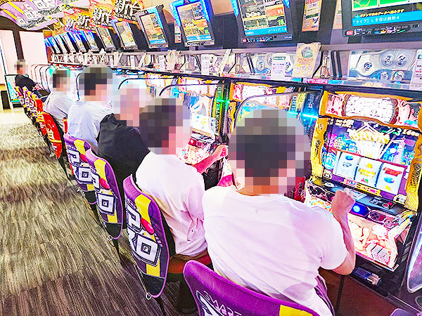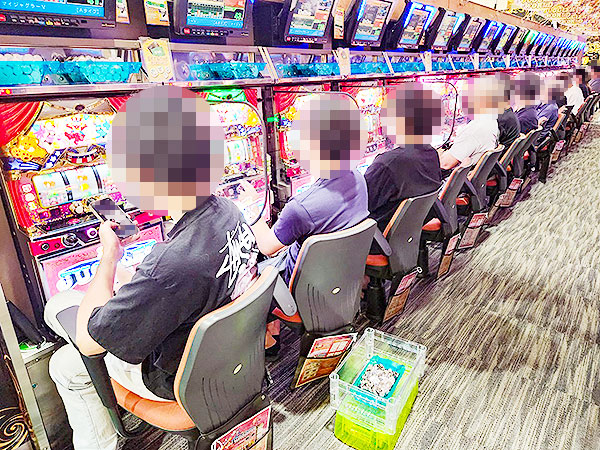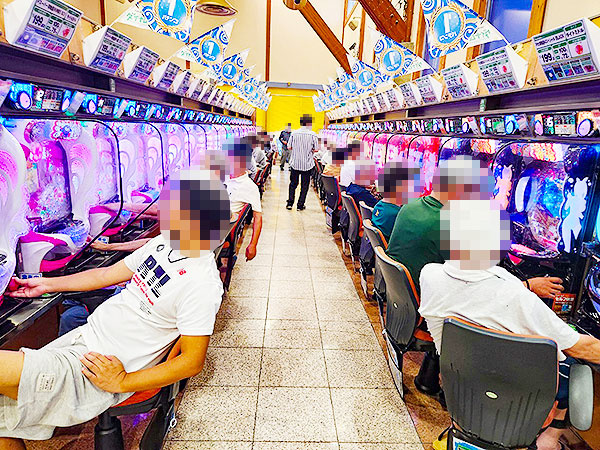 取材時は多くのプレイヤーが来店。パチンコ・パチスロともに、様々な機種が支持を得ていた。