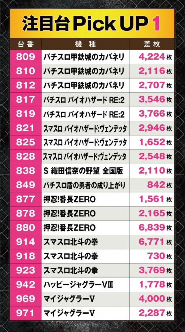さらに『パチスロ甲鉄城のカバネリ』や『パチスロ バイオハザード RE:2』、『マイジャグラーⅤ』など、3,000枚・4,000枚を超える台が多く、店内はどこからでもチャンスを掴めるといった印象を受けた。この結果を踏まえて、次回降臨の際は是非あなたがチャンスを掴んで欲しい。