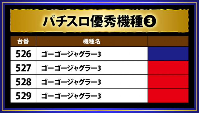 この日に稼働率が高かったのは以下の4マシン。まず注目はジャグラーシリーズ3機種をチェックしよう。