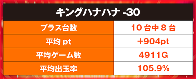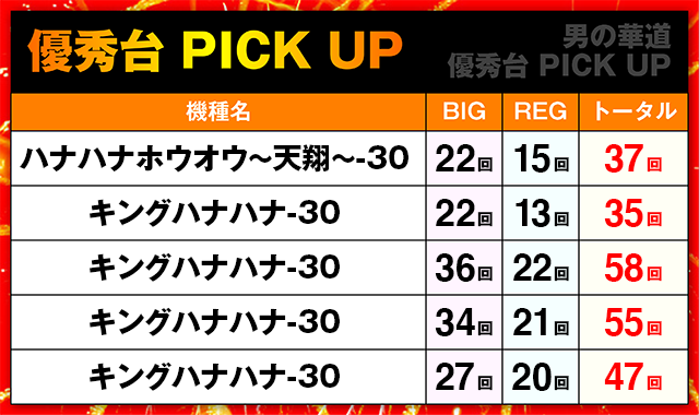 「キングハナハナ-30」からは、ボーナス回数が58回の台を筆頭に、4台をピックアップ。