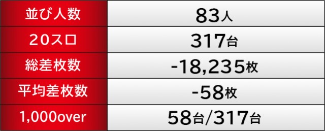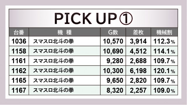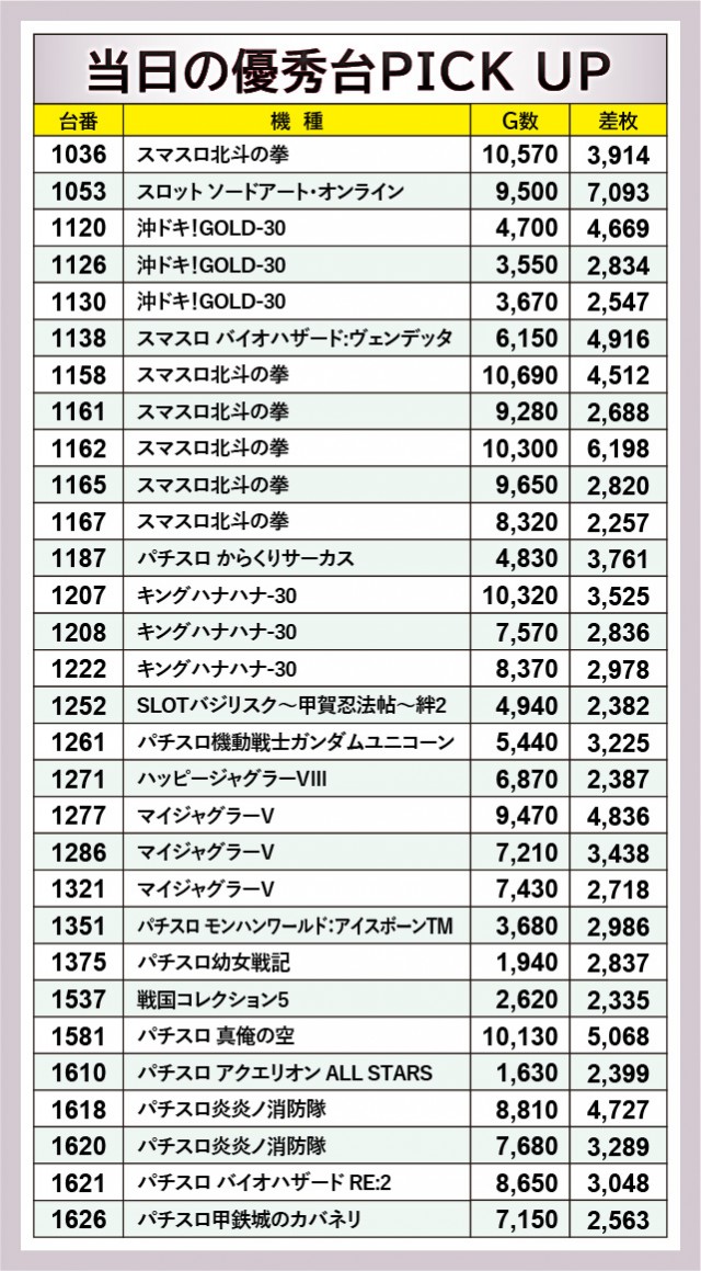 上表の優秀台をご覧の通り、『スマスロ北斗の拳』『キングハナハナ-30』『パチスロ 真俺の空』にて合計4台の万回転OVERを確認できる。その他にも8~9千回転台をマークしている台が見られ、朝から閉店まで打ち込まれた状況から、ファンの手ごたえのほどを窺わずにはいられない。また差枚数に関しても、『スロット ソードアート・オンライン』1053番台+7,093枚や『スマスロ北斗の拳』1162番台+6,198枚と、大きな熱気を放っていたのも見逃せない。
