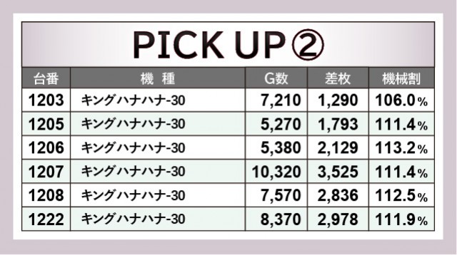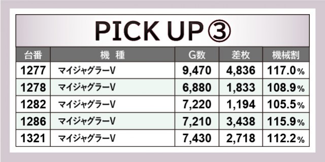 一方でノーマル機群は、『キングハナハナ-30』が凄まじい活気と熱気を放っていた。万回転OVERはもちろんのこと、多くの台で回転数と差枚数が比例する展開を披露していたのが目に焼きつく。それは『マイジャグラーⅤ』も同様で、1277番台+4,836枚のように、明らかな好感触が窺える台も見られる。コンスタントに輝く告知ランプは、間違いなくファンに笑顔をもたらしたはずだ。