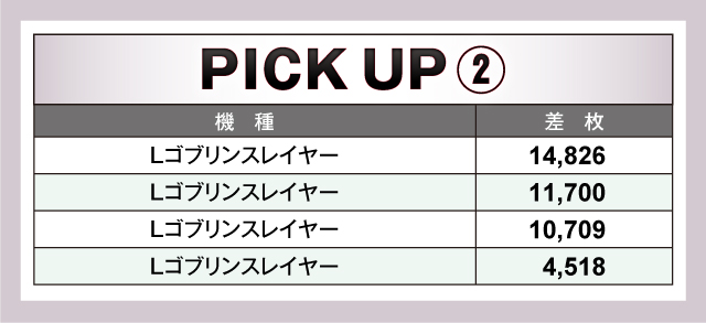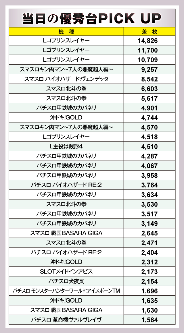 優秀台として注目したいのは『Lゴブリンスレイヤー』。+14,826枚、+11,700枚、+10,709枚と、実に3台が大台突破の大盤振る舞い。この機種の持つポテンシャルの高さをこれ以上ない形で見せつけてくれた。そして惜しくも大台には届かなかったが、+9,257枚をマークした新鋭『スマスロキン肉マン〜7人の悪魔超人編〜』、今後注目の機種と言えよう。続いては『スマスロ バイオハザード:ヴェンデッタ』。+8,542枚をマークし、定番シリーズのスマスロとして、早くもファンの心をつかんでいる。以下、+6,603枚、+5,617枚の『スマスロ北斗の拳』、4,901枚の『パチスロ甲鉄城のカバネリ』、+4,744枚の『沖ドキ!GOLD』、+4,510枚の『L主役は銭形4』などが続いた。