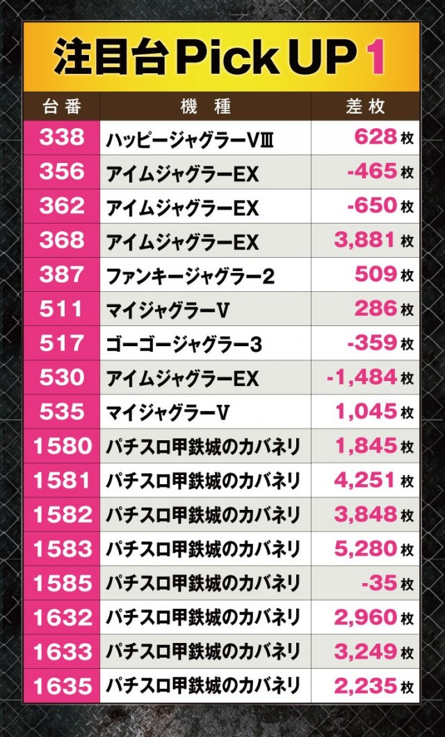 『パチスロ甲鉄城のカバネリ』はほとんどの台がプラスで、対象平均2,954枚と大盛り上がりだった。次回のブラックエンジェルス降臨の際も、是非この結果を参考にしてほしい。