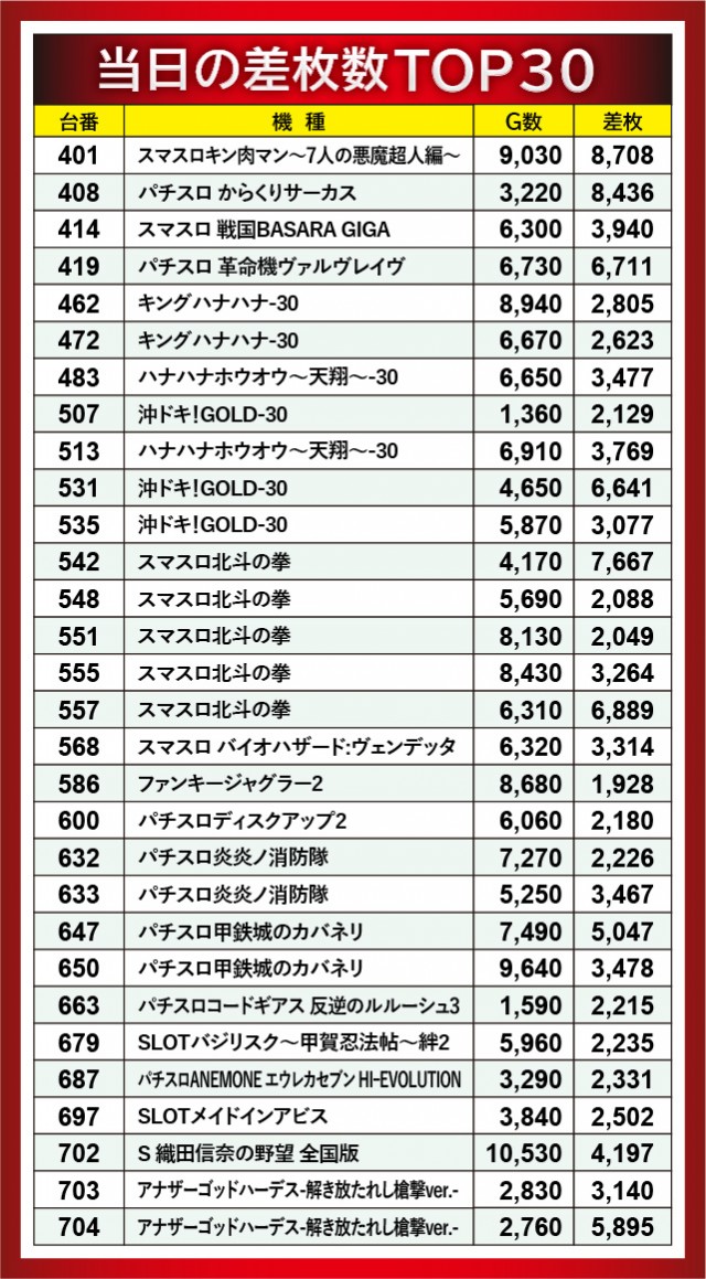 『スマスロキン肉マン~7人の悪魔超人編~』401番台+8.708枚や『パチスロ からくりサーカス』408番台+8,436枚と、2台の8千枚OVER台が何よりも目に焼きつく。さらには『スマスロ北斗の拳』542番台+7,667枚のように、人気機種から凄まじい熱気が放たれていたのも見逃せない。また『S 織田信奈の野望 全国版』に関しては万回転OVERを達成しているため、あらゆる機種にチャンスが潜んでいた様子が窺えるばかりだ。
