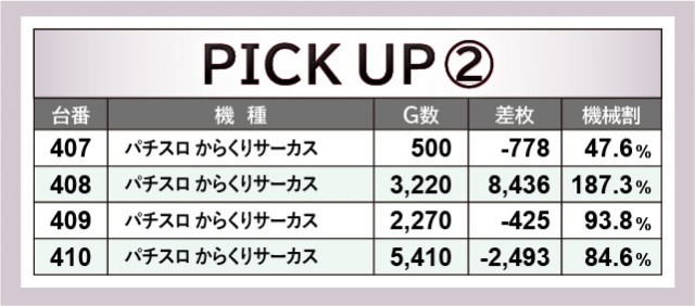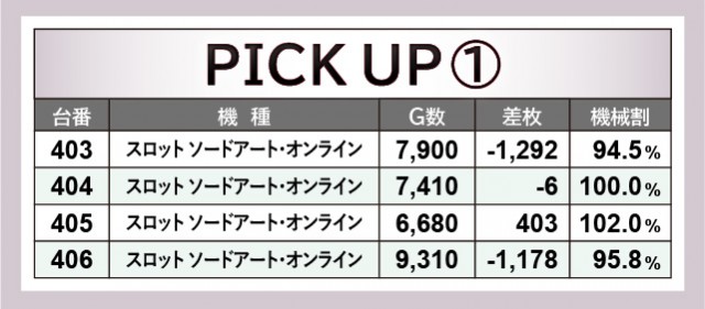 『スロット ソードアート・オンライン』は4分の2でプラス差枚を達成。しかし大きな差枚数に到達しておらず、当日は不発だったと言える内容になっている。対して『パチスロ からくりサーカス』では408番台+8,436枚と大きな熱気が鮮烈だ。しかしこちらでも他3台がうまく波に乗れていない。とはいえ、両機種ともに全台がチャンスだったことから、ファンは手ごたえを感じては、力強くレバーを叩いていたはずだ。