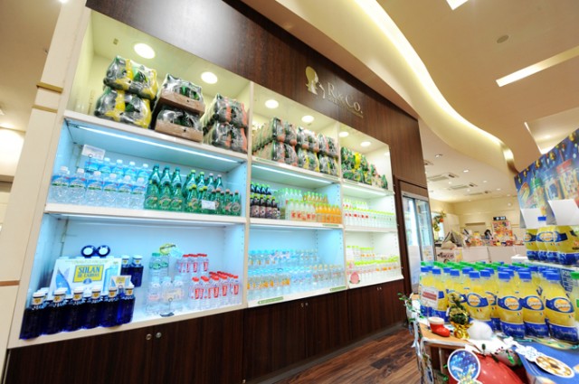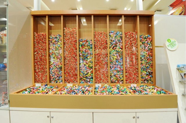 クリスマスに合わせた季節物から、バッグや小物などの高級装飾品、はては冷凍食品まであります。清涼飲料の棚もドドーンとこの大きさです。さらに、ぎっしり積み上げられた飴の棚にはビックリ! コレ、どうやって補充してんですか?