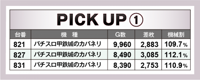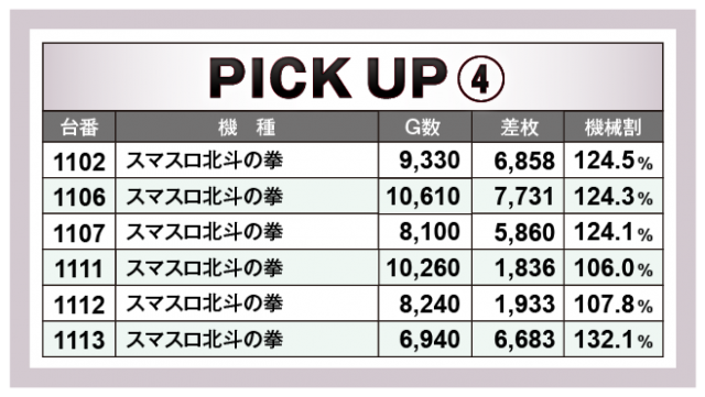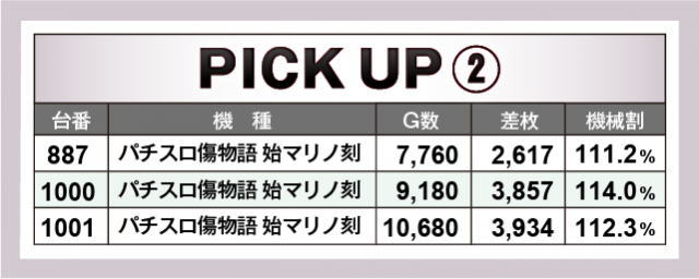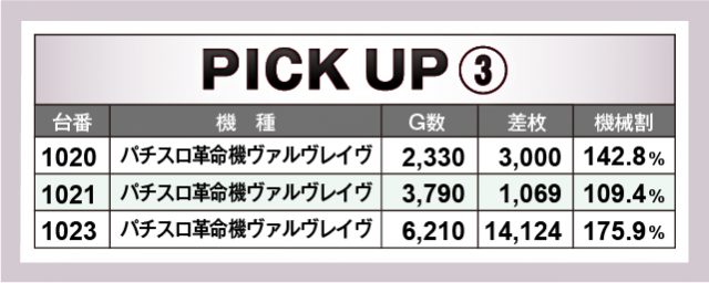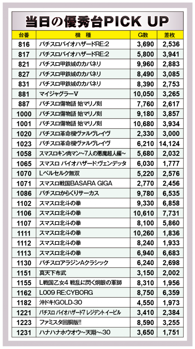 まずは優秀台をチェックをすると、ファンからの支持を集めた機種が一目瞭然だと言えるだろう。すなわち、朝からじっくりと打ち込まれた機種が明白で、『スマスロ北斗の拳』『パチスロ甲鉄城のカバネリ』『パチスロ傷物語 始マリノ刻』などが挙げられる。中でも、1106番台+7,731枚や1001番台+3,934枚など優秀結果が目立った。また、1023番台『パチスロ 革命機ヴァルヴレイヴ』で+14,124枚と大迫力な結果を記録し、各機種が迸る熱気を放っていた点は、ファンの満足度を表しているようだ。