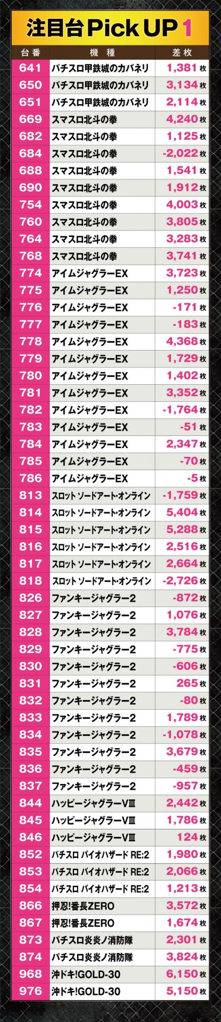 さらに『アイムジャグラーEX』と『ファンキージャグラー2』はそれぞれ10台以上、『ハッピージャグラーVⅢ』や『パチスロ バイオハザード RE:2』は3台など、各機種複数並びでの好調台を確認している。