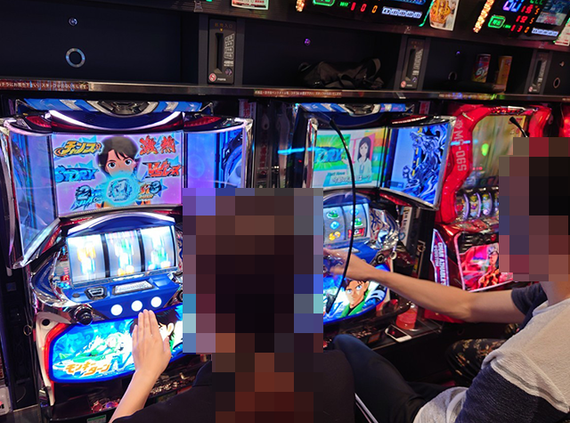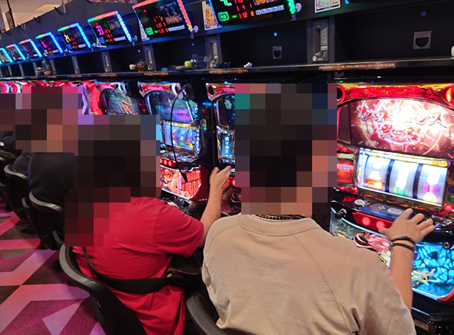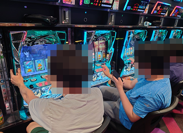夕方頃のパチスロでは、『スロット ソードアート・オンライン』と『HEY!エリートサラリーマン鏡』に笑顔のプレイヤーが並んでいた。