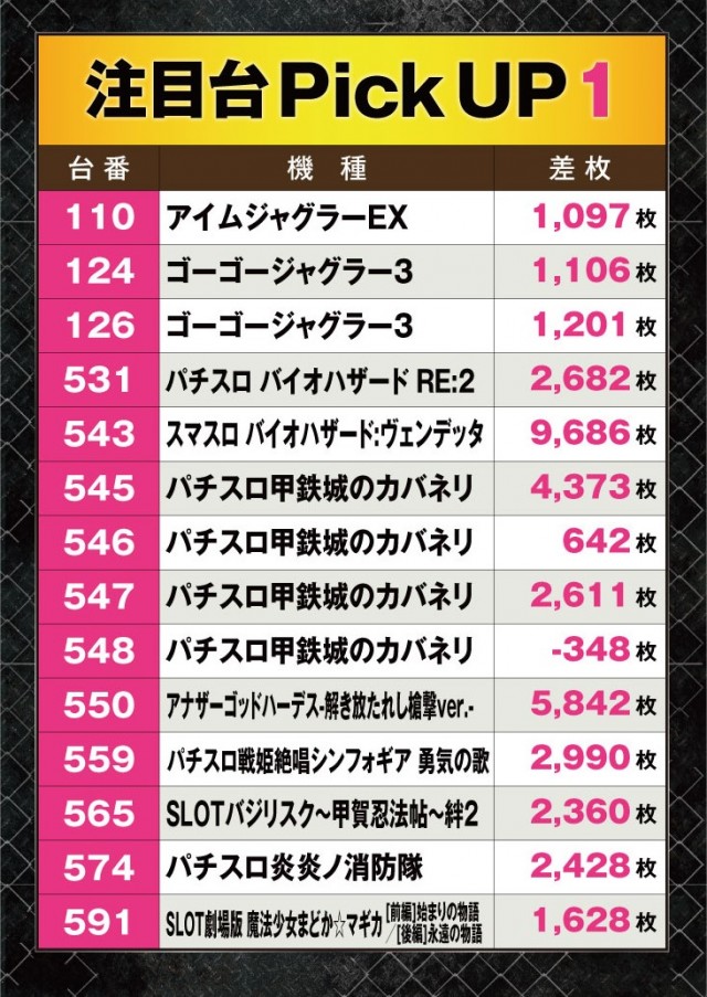 今回は店内の様々な機種から好調台が誕生していたのが目に付いた。そして1台を除きすべての台がプラスと素晴らしい結果になっているのがわかる。