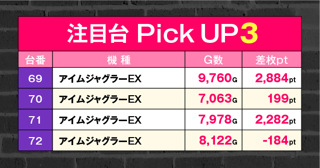 『アイムジャグラーEX』コーナーでは4台並びを目撃。72番台だけヘコんでしまったけど、4台とも優秀台で間違いない気がする。4台ともずっと座られてたしね。