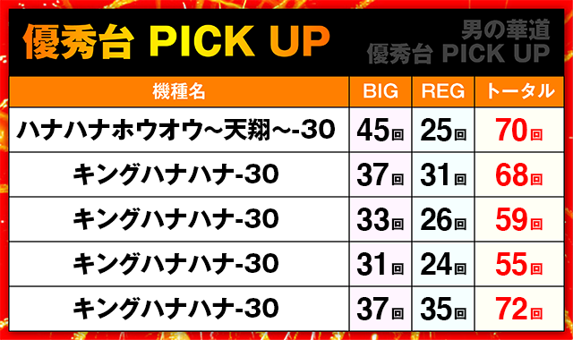 「ハナハナホウオウ~天翔~-30」からはボーナス回数が70回を記録した台を、「キングハナハナ-30」からは72回の台を筆頭に4台を選んだ。