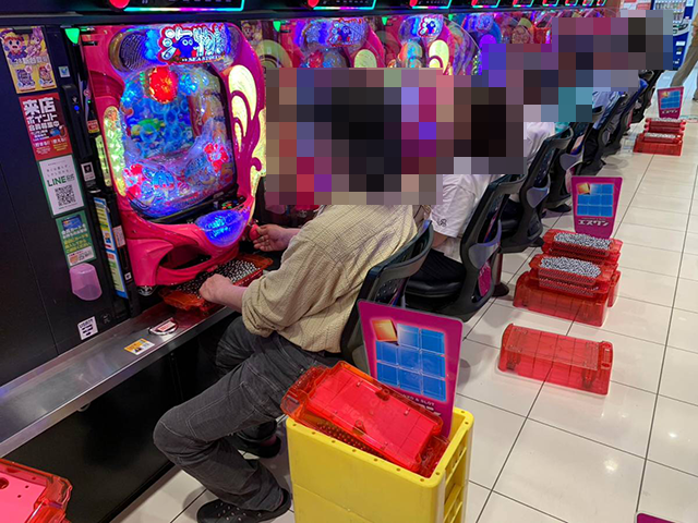 午後はほぼ満席となっており、多数の4箱以上の持ち玉で遊技をおこなっているプレイヤーの姿があった。