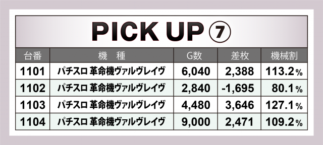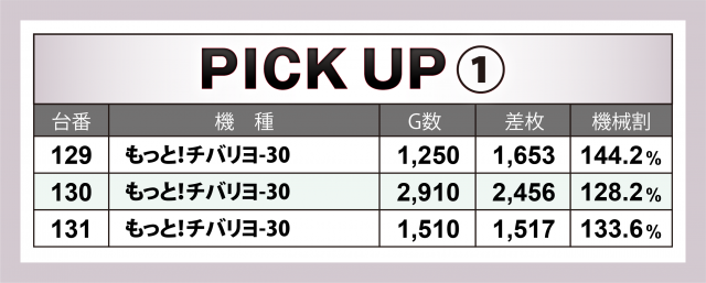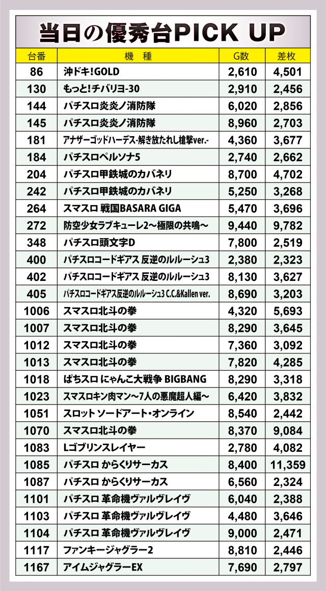 最初は優秀30台のPICK UPからチェック。30台の全てが差枚数+2千枚以上を達成、+3千枚以上は18台、+4千枚オーバーは8台、+5千枚オーバーは4台と、定例だがハイレベルの結果となった。