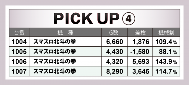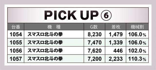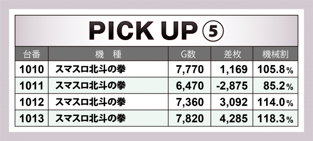 注目は『スマスロ北斗の拳』。+5千超×1&+4千超×1&+3千超×2と、複数の好調台を輩出する中、横並び以外となる1070番台が+9千枚オーバーをマークした。