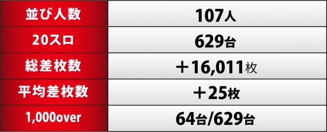 今回、[1000円/46枚]スロ629台はトータル+16,011枚とプラスに成功したものの、以前達成したような大記録と比較すると物足りないのが正直なところ。