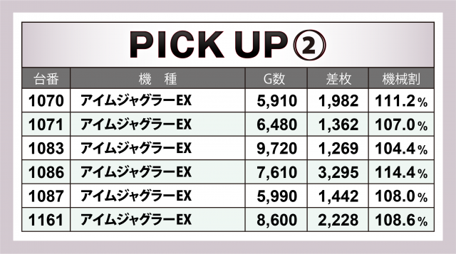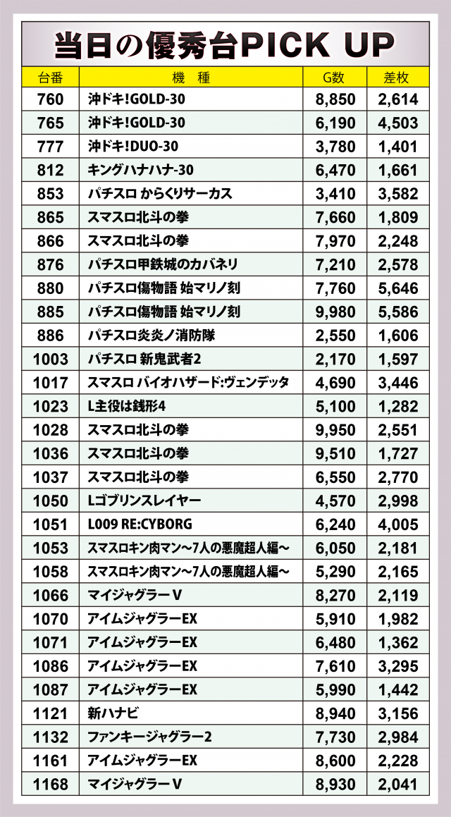 ここからは20スロ全193台の出玉データをチェックし、当日の優秀台の詳細に迫っていこう。