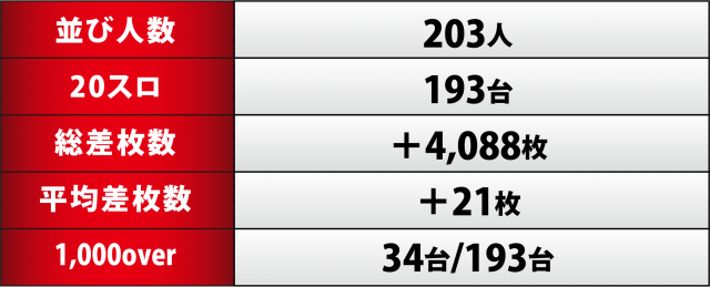 今回、20スロ193台のトータル差枚数は+4,088枚と辛勝。同店の実力から考えると、正直物足りない感想を抱いてしまう。