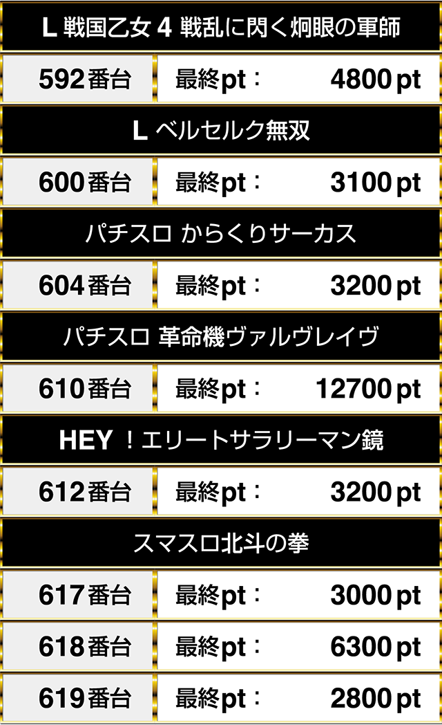 3000pt以上の台が『L戦国乙女4 戦乱に閃く炯眼の軍師』や『パチスロ からくりサーカス』などにもあった。