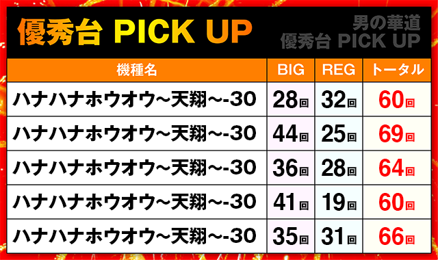 「ハナハナホウオウ~天翔~-30」から、ボーナス回数が60回以上の台をピックアップした。