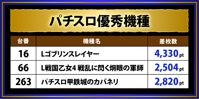 その他では前回調査に続いて好調の『パチスロ甲鉄城のカバネリ』、『ゴブスレ』と同じくスマスロ機の『L戦国乙女4 戦乱に閃く炯眼の軍師』の差枚数が光った。