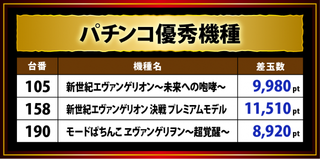 奇しくも優秀3台全てがエヴァシリーズ、甘デジスペックながら5桁のプラスを達成した『新世紀エヴァンゲリオン 決戦 プレミアムモデル』158番台がこの日の低王と化した。